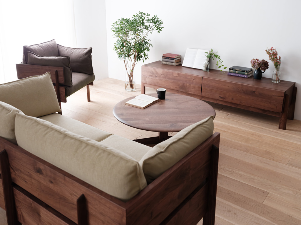 ソファ 168/ラウンジチェア/サークルコーヒーテーブル 091/テレビボード 190/すべてウォールナット