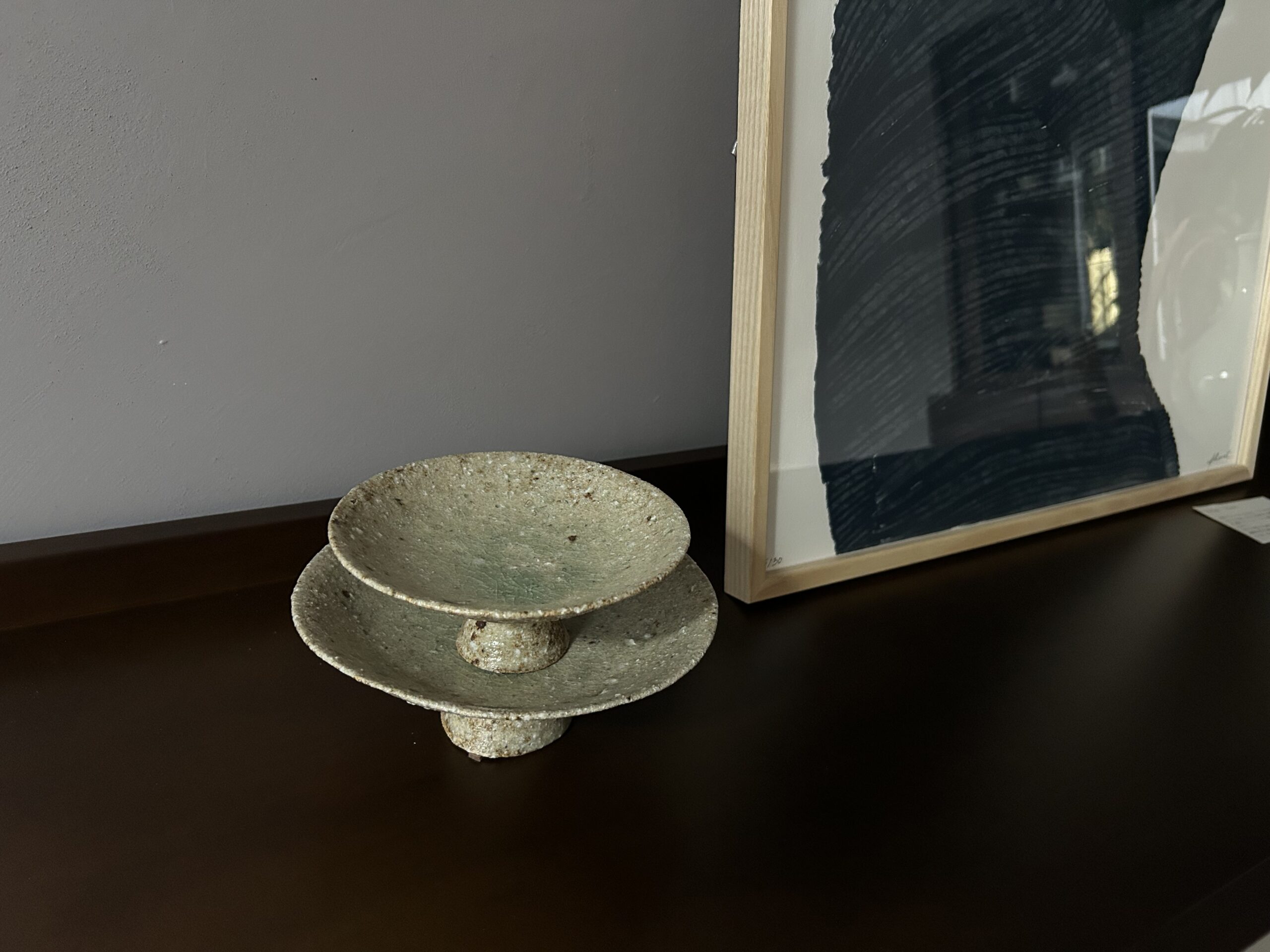 アートポスターやオブジェ、ガラス作品は金属の置物など素材のミックスが相性良いです。
