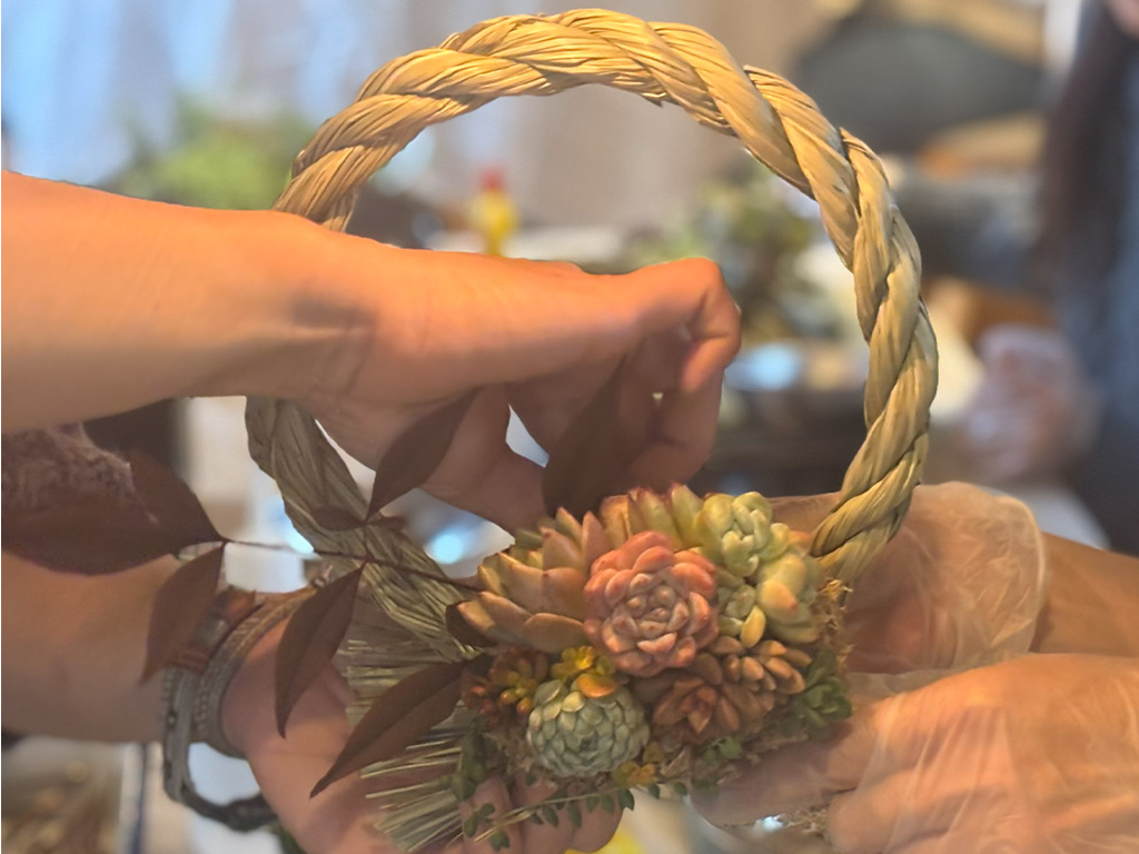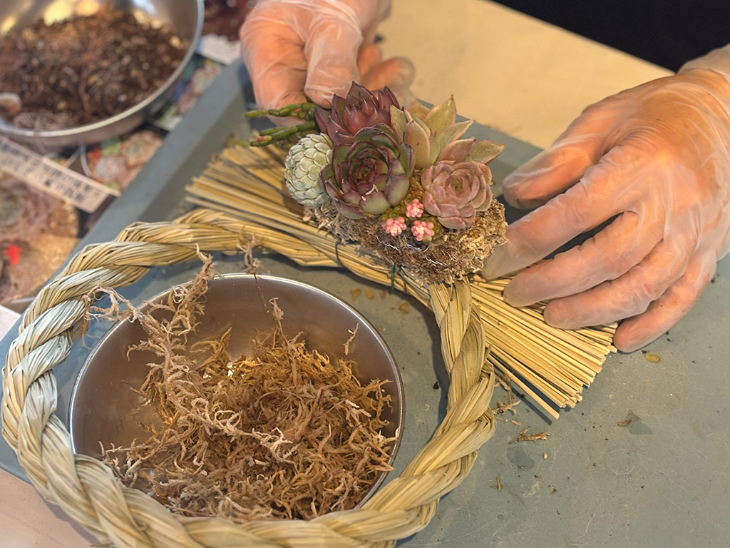 今回制作したのは、年末年始にぴったりなお正月飾り「多肉しめ縄リース」。しめ縄を飾る期間が終わった後も、多肉植物を鉢に移して楽しめるアレンジ方法を教えていただきました。
