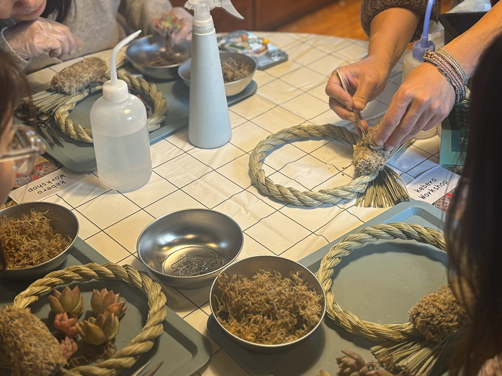 制作を終えたあとの作品を眺めながら、皆さまそれぞれのきっかけや想いをお聞かせくださいました。多肉植物のワークショップに何度もご参加くださっているリピーターの方や、いつも購入しているしめ縄を「今回は自分で作ってみたい」と、初めてワークショップにご参加くださった方もいらっしゃいました。また、本店でのワークショップに初めてご参加くださる方も多く、こうしてお話を伺いながら過ごす時間は、私たちにとっても嬉しく、2日間を通してあたたかなひとときとなりました。