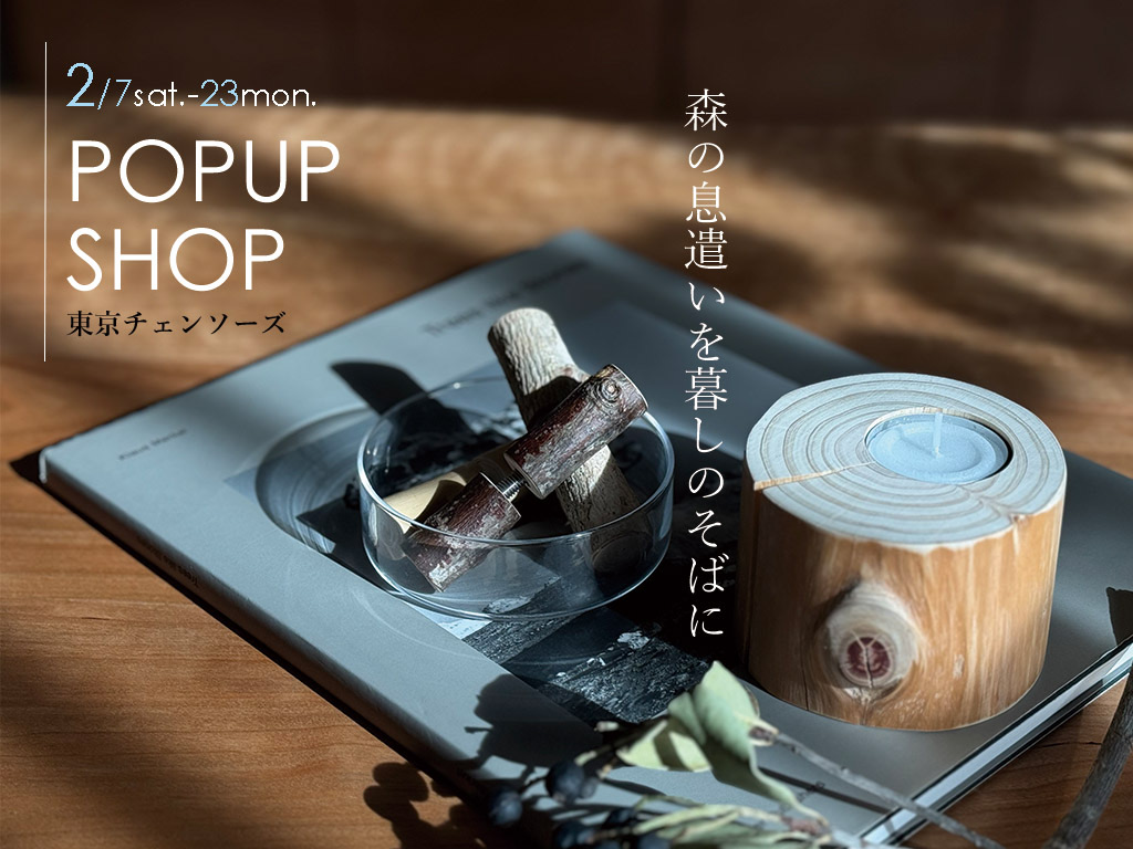 青山店では2月7日(土)~2月23日(月)まで東京チェンソーズのPOPUPを開催いたします。木材市場では、まっすぐとした太い幹のみ扱われている現状があります。しかし東京チェンソーズは、規格外とされている幹の細いものや、節のあるものなど個性あふれる素材として手間をかけながら魅力的なプロダクトを企画されております。自然の豊かさを身近に感じられるユニークなアイテムが揃います。日常使いに、贈りものとして、ぜひお選びください。