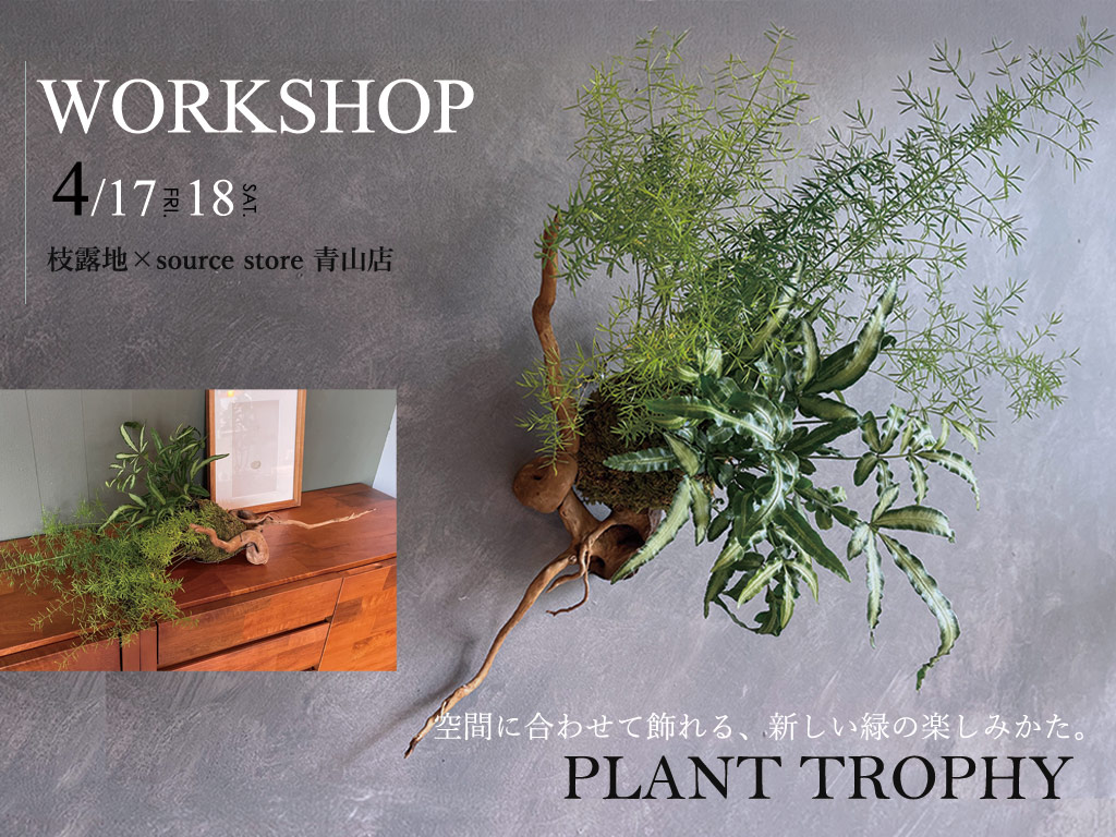 今回は「プラントトロフィー」として、観葉植物と流木を立体的なオブジェへと仕立てる、インテリアグリーンをお作りいただきます。
