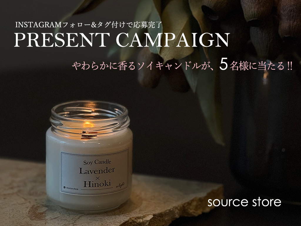 新生活のためにsource storeで手に入れた家具でコーディネートしたお写真をInstagramでシェアしませんか。ご自宅のsourceアイテムのお写真をフォローの上、タグ付けフィード投稿していただいた方の中から抽選で、source の世界観を香りで表現したソイキャンドルを5名様にプレゼントいたします。
