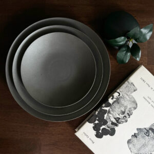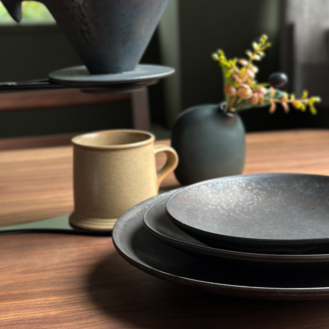 島根県の工房で、こちらも職人の手作業で作られるOASI。表面にはマットな質感が特徴の黒泥(コクデイ)が使われ、その質感を生かすため、釉薬にはチタンを採用し、内側は飲み物の色目が引き立つ白色に仕上げています。