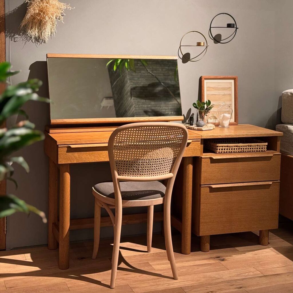 ■ 自然のぬくもりを感じるラタン背もたれに使われている天然ラタンは、しなやかな弾力で体をやさしく包み込み、通気性にも優れているため、長時間座っていても快適です。 お部屋に置くと天然素材ならではのあたたかみと、圧迫感のない軽やかな印象が生まれ、繊細な編み目が空間にほどよいアクセントを添えます。