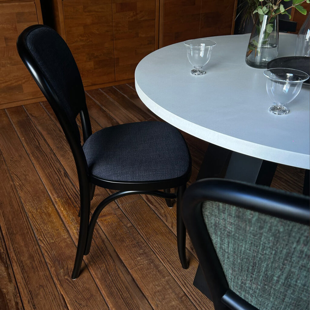 曲木が生み出す柔らかな佇まいは、デスクやドレッサーの横に一脚置くだけでも絵になります。 サークルテーブルと合わせれば、曲線同士が美しく響き合い、軽やかで上品な印象に。 『毎日使うダイニングテーブルにモノトーンで合わせるコーディネイト』 ▪サイドチェア Z ブラック TORCERE ▪サークルダイニングテーブル PURO MORTEX ( MORTEXは店舗限定です )