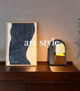 木目を基調とするsourceの家具には、少し明るめの色彩のアートを飾って差し色として取り入れると、空間に個性が生まれます。また、ナチュラルなネイビーやグレーといった落ち着いた色を選べば統一感が生まれ、穏やかで心地良い空間になります。フレームひとつでも飾り方次第で印象がぐっと変わるので、フレーム選びや配置も楽しみのひとつです。