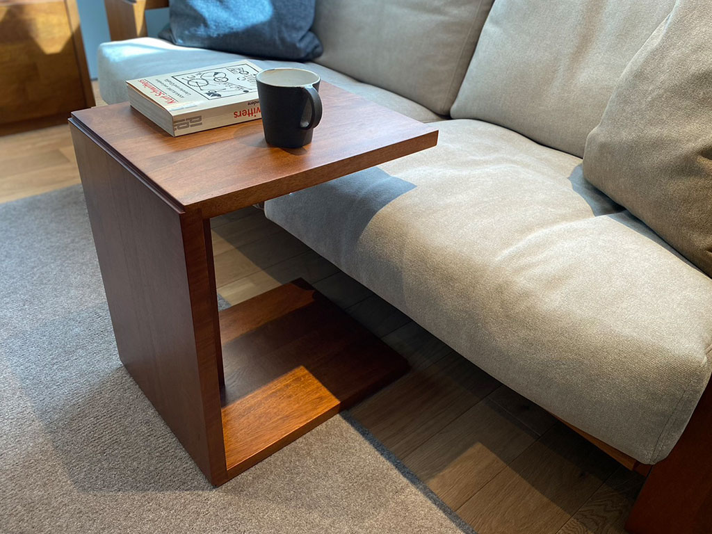 コの字型のサイドテーブルがおすすめです。座り方やシーンに合わせて手軽に動かすことができ、ソファの下に差し込んで使えるのも魅力。ノートパソコンや飲み物を置く簡易的なリビングテーブルとしても活躍し、空間を圧迫せずリビングを広く使うことができます。