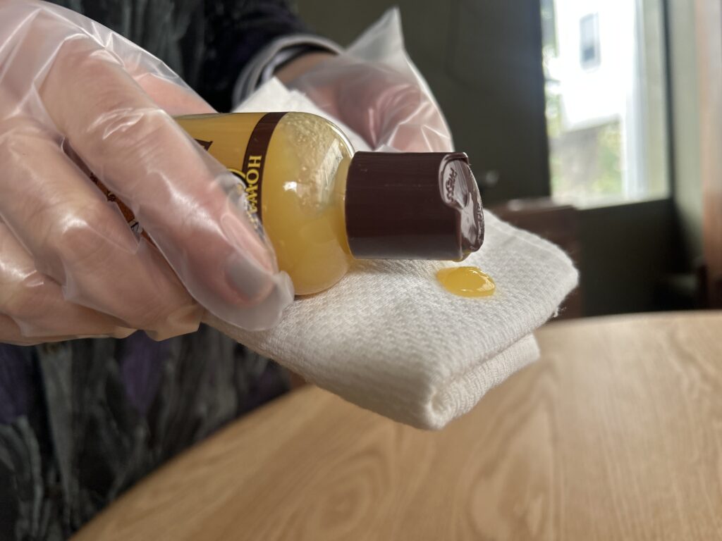 落ち着いた色味と美しい木目が特徴のウォールナット材を使用。天板の角は大きく面取り加工が施され、柔らかな手触りと安全性を両立しています。